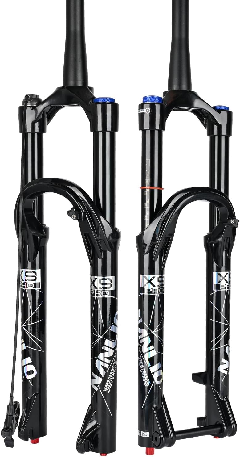 Upgrade your mountain biking performance with the Nanlio X9 PRO 34MM Suspension Fork, designed for 26", 27.5", and 29" MTB wheels. This fork features a premium oil & air damping system, offering smooth compression and rebound for various terrains. With manual lockout, riders can adjust performance on the fly, whether climbing steep hills or descending rugged trails. Available in 140mm or 160mm travel, the X9 PRO offers robust 34mm stanchions and forged magnesium alloy crown, delivering a perfect balance of lightweight construction and high rigidity. Compatible with 100x15mm or 100x9mm axle sizes.
