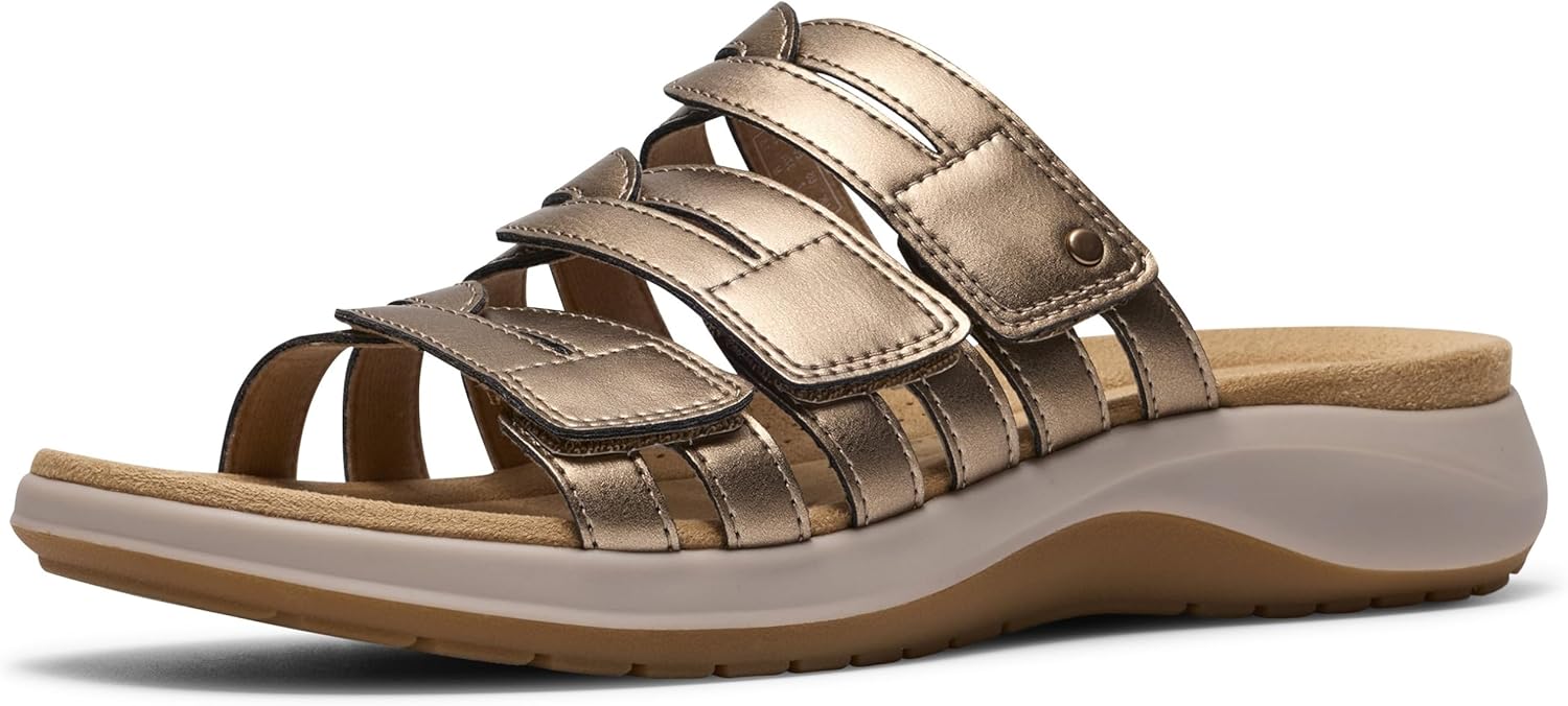 Maelynn Abby is designed to be a versatile companion to the beloved Laurieann, offering a more casual and crafted feel. With distinct uppers and a comfortable bottom, this sandal expands Clarks Collection heritage casual collection, becoming a staple in any style seeker's wardrobe. - Premium leather upper with studded metal accents - Ultimate Comfort 5mm PU foam footbed delivers all-day cushioning and support - Hook and loop closures offer optimal adjustability and a secure fit - Smooth jersey lining has a soft feel against the foot - Soft microfiber sock lining enhances breathability and comfort - TPR outsole provides grip and flexibility - Heel height: 35mm