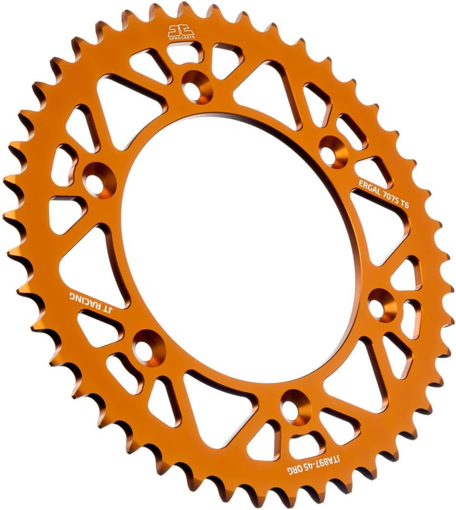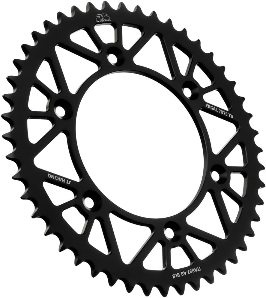 Made from advanced aviation-grade 7075-T6 aluminum alloy, optimal lightweight design and CNC-machined for performance and lifespan! All aluminium MX rear racing sprockets are manufactured from the best materials with a special self-cleaning design, and ha Made from advanced aviation-grade 7075-T6 aluminum alloy, optimal lightweight design and CNC-machined for performance and lifespan! All aluminium MX rear racing sprockets are manufactured from the best materials with a special self-cleaning design, and ha Made from the finest 7075-T6 aluminum. Designed and built with the latest generation of computer design and control metal cutting equipment for maximum durability. Heat-treated and hand-finished to meet or exceed the highest possible quality standards. Note: Designated models require the purchase of a JT Sprocket Carrier, sold separately.