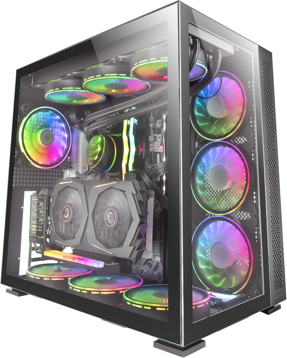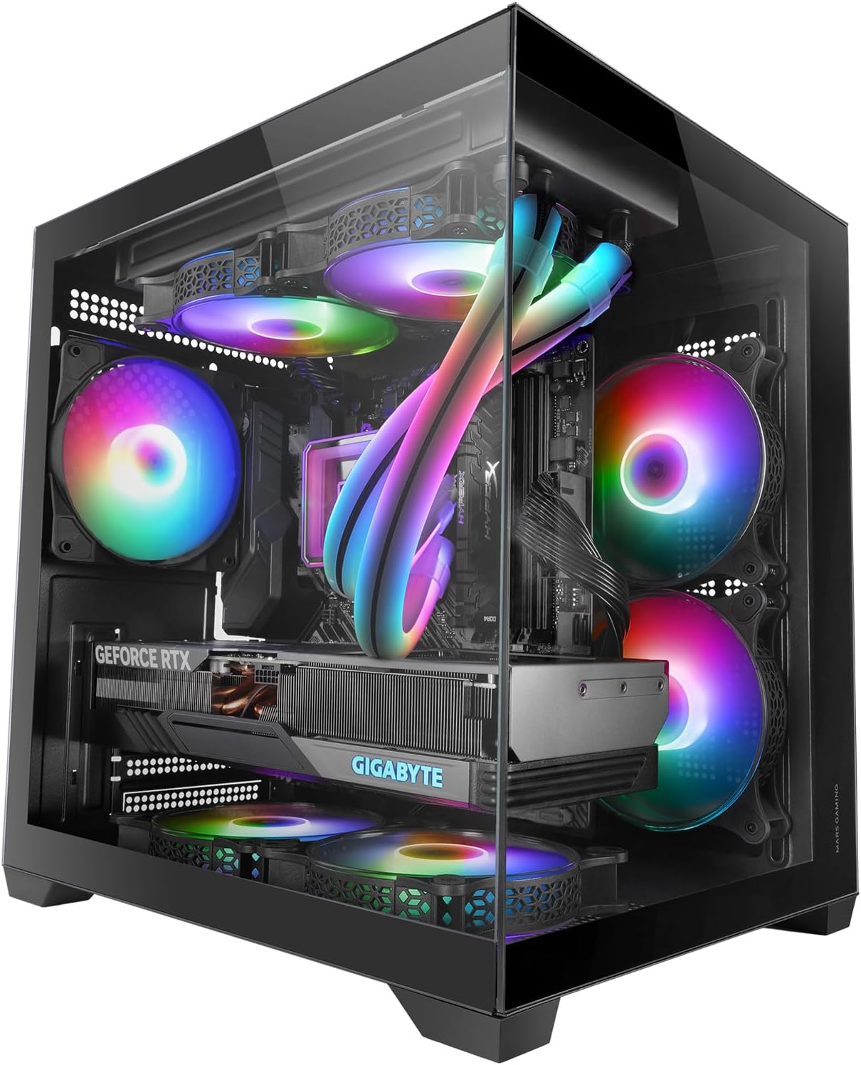 The MC-REV case is designed to take gaming performance and aesthetics to the next level; its revolutionary airflow system with three 25° inclined ARGB fans directs cool air directly to the GPU and the motherboard, ensuring optimal heat dissipation in any configuration; the double chamber structure improves airflow and cable management, while compatibility with reverse port motherboards for a clean and organisThe vertical GPU mounting system also allows an impressive presentation of your hardware; thanks to the screwless design with tempered glass plates, the MC-REV can be mounted quickly, effortlessly and with a stunning panoramic view of your setup