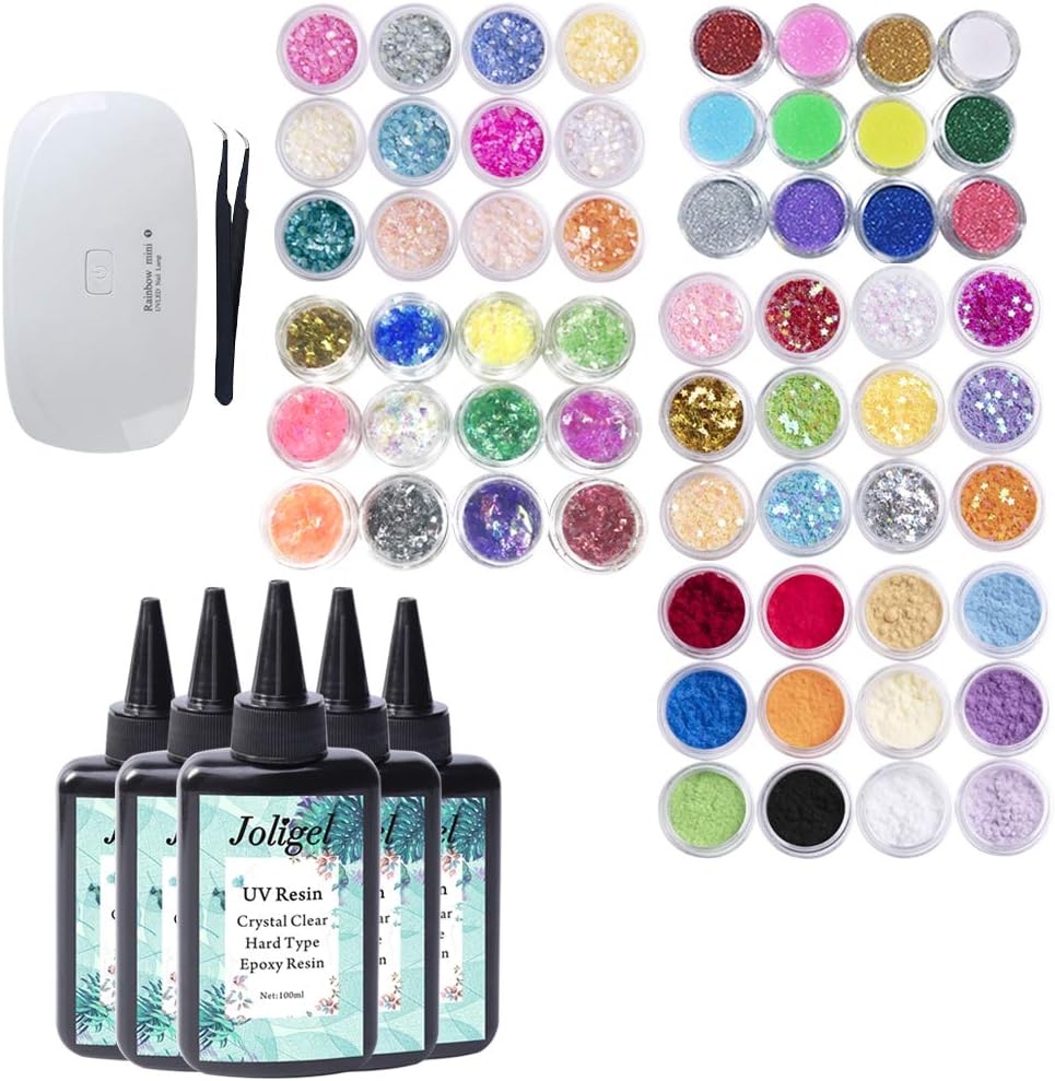 | Included Components | 5x UV epoxy resin 100ml, 1x Portable UV lamp with USB cable, 1x Tweezers, 5x Silicone molds, 100x Golden eyelets, 13x Liquid pigment, 12x Holographic glitter powder, 12x Holographic pentagram, 12x Colorful glassine with rainbow sheen, 12x Velvet powder, 12x Nacre shell small pieces, Instructions |